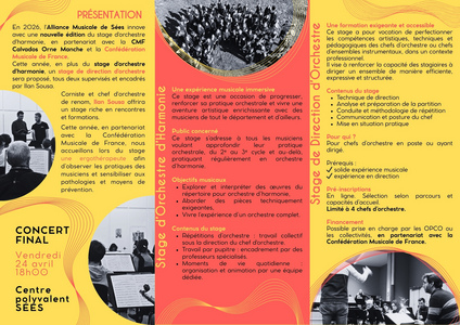 Dates du séjour : du 20 au 24 avril 2026 (accueil à 9h - fin du stage à l'issue du concert - lieu salle Polyvalente de Sées)
