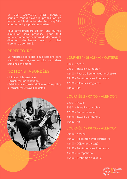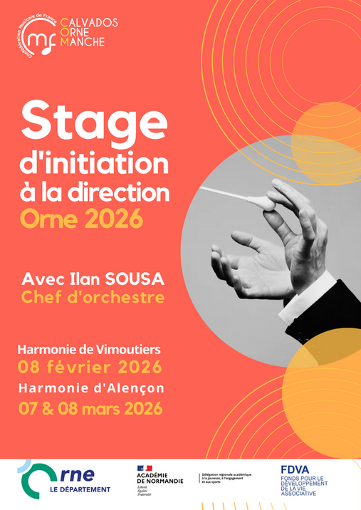 Retrouvez le stage d’initiation à la direction d’orchestre le 8 février à Vimoutiers et le Week-end du 07-08 Mars 2026 à Alençon, avec la participation des orchestres d’harmonie de Vimoutiers et Alençon.